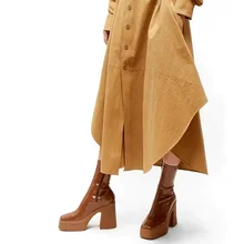מעצבי סתיו חורף מותג עור מיקרופייבר אלסטי מגפי קרסול עקבים גבוהים נעלי עקב פלטפורמה עבה וחום