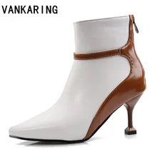 עור מגפי נשים שיק + בד מתיחה נעים של סתיו אישה עקבים עקבים מגפיים קרסוליים הבוהן מחודדת משאבות נשיות zapatos mujer