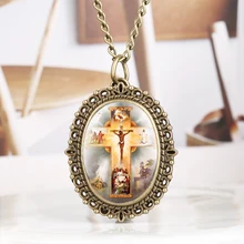 שעון כיס בציר ברונזה מעולה דפוס ישו צלב שעון תליון שעון צורת אליפסה נשים שעון שרשרת מתנות ליידי שרשרת
