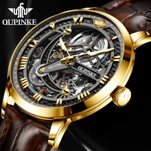 OUPINKE מותג יוקרה גברים שלד אוטומטי מכני שעון מכאני אופנה שעוני ספיר קלאסי עור עמיד במים זוהרים