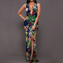 שמלת מסיבה נשף ארוך נשים Bodycon צווארון עמוק עם צווארון ללא שרוולים צמח באורך הרצפה סקסי מיקרו-אלסטי הדפס שמלות מקסי מפוצלות