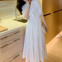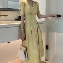 שמלות שיבה הביתה פשוטות ארוכות מוצקות עם רוכסן באורך תה כפתור צווארון V שמלות וינטג 'שיקיות לחופשת שיבה