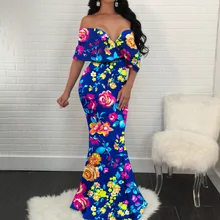 שמלות בת ים כבוי כתף פרחונית אלגנטית ארוכה שמלת מסיבה סקסית אפריקאית אופנה נשים קיץ כחול Bodycon בציר חלוק