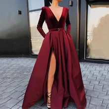 שמלת מסיבה שמלות ארוכות שרוולים ארוכים עם צווארון עם צווארון בצבע בורדו באורך רצפה אלגנטי סקסי רגיל שמלות מקסי מפוצלות אונליין לנשים