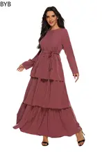 עבאיה דובאי טורקיה שמלה מוסלמית קפטן קפטן שיפון בגדים אסלאמיים לנשים Musulmane Ramadan שכבות חלוק סביב צוואר עגול