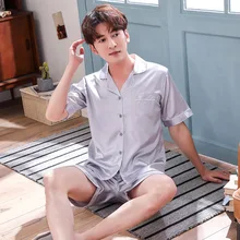 סט פיג'מה גברים אביב קיץ סתיו גברים פיג'מה משי סאטן סטים מכנסיים קצרים חולצה הדפסת פיג'מה של גברים כפתורי הלבשת סגירה