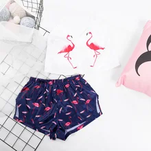 CAWA פלמינגו הדפס קריקטורה יפה פיג'מה אופנה קצרה נשים חליפת בית חליפת קיץ חליפת מכנסי סאטן רצועות ספגטי סקסיות