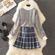 2020 סתיו משובץ חדש סוודר סוודר בצבע ניגודיות בצבע ניגוד + חצאית קפלים 2 חתיכות סטים חליפות סוודרים דקים שמלה