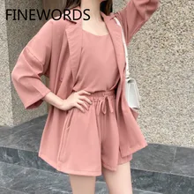 FINEWORDS סט 3 חלקים נשים קיץ חולצות קלע סקסיות ומקטורן ומכנסיים קצרים וינטג 'בגדי נשים קוריאניות Conjuntos De Mujer