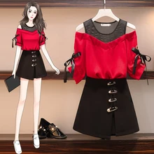 פלוס נשים בתוספת גודל 2020 קיץ אחיות שומן קוריאניות חדשות בסגנון זר חולצה רופפת כתפיות פראיות שמלת סט חליפת שני חלקים סט