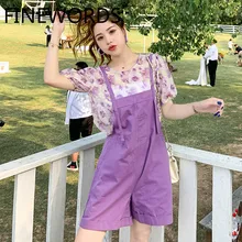 FINEWORDS 2 סטים סטים תלבושות נשים חולצה פרחונית וסרבל ג'ינס סגול אימונית קיץ מזדמן נשים 2020 קוריאני בגדים