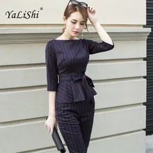סט שני חלקים 2020 סתיו משרד חליפה עסקית נשים שרוולים ארוכים עם שרוולי O- צווארון פסים עם חולצות פסים ותשע מכנסיים סטים עם סט שני חלקים