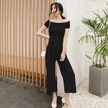 אלגנטיות מזדמנים שתי חתיכות סט לנשים קיץ 2019 סלאש צוואר סרוג חולצה ואימפרי רגל רחבים מכנסי נשים שחורות סט 2 חלקים