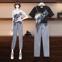 גודל גדול נשים קיץ 2020 חולצת טריקו להפחתת עידן חדש + כיסוי ג'ינס בשר היו חליפות שתי חלקים סט קיץ נשים שני חלקים