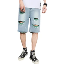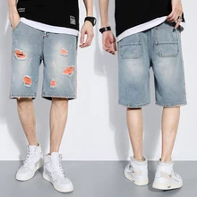 פנאי אופנה חדשה לגברים מכנסי ג'ינס קצרים מכנסי ג'ינס קצרים מכנסי כותנה רגליים רחבות מכנסי ג 'ינס קרעים לנשימה זכר
