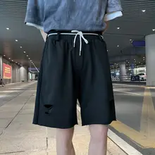 2020 קיץ חדש לנוער פופולרי גברים צבע אחיד חור מכנסי חמש נקודות מכנסי ספורט מזדמנים שחור / אפור