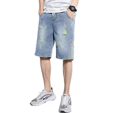 אופנת קיץ חורים קרועים ז'אן מכנסיים קצרים שרוך טלאים רופפים פנאי ג'ינס קצרים בגדלים גדולים גברים מכנסי ג'ינס בגדי רחוב 5XL
