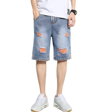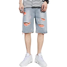 2020 קיץ נוער חדש פופולרי גברים שטופים חור שבור Loose גודל גדול מכנסי ג'ינס אופנה מזדמנים מכנסי חמש נקודות