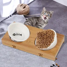 קערת חתולים לכלה קערות קרמיקה כפולות עם בסיס במבוק מזון מזון לחתולים מים מזין אספקת שתיית מזון נירוסטה