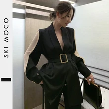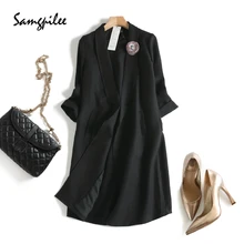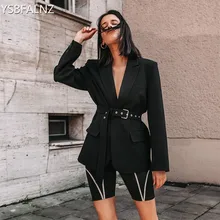 הנשים בלייזר Feminino מתכת חגורת אבזם זהב בלייזרים שחורים Femme אופנה גבירותיי מעיל להאריך ימים יותר Mujer 2019 באיכות גבוהה