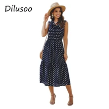 Dilusoo נשים הדפסת נקודות שמלה קפלים ללא שרוולים נקבה 2020 שמלות Boho קיץ אלגנטיות באורך קרסול שמלת חג Vestidos