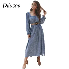 הדילוסו פרחוני נשים שמלת מקסי שרוול ארוך שרוול ארוך נקבה 2020 שמלות מקרית אביב צווארון מרובע אלגנטי שמלת חג Vestidos