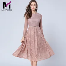 שמלת תחרה ורודה מרצ'ל 2019 מסלול אביב סתיו נשים אלגנטיות צוואר עגול חלול אלגנטיות שמלות מסיבה ארוכות Vestidos
