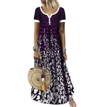 S-5XL גודל גדול חוף חוף שמלה ארוכה שמלת קיץ מקרית שרוול קצר V צוואר טלאי שמלת כותנה נשים שמלת הדפס פרחוני רופף