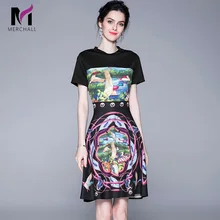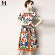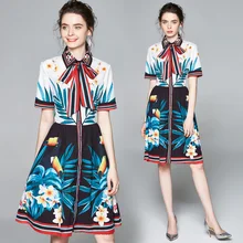 שמלת שרוול קצר מסלול האופנה אביב 2017, צווארון חגורה לנשים ססגוני הדפס פרחוני וינטג 'שמלה אלגנטית