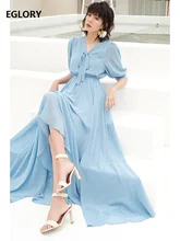 שמלה ארוכה כחולה 2020 קיץ באיכות גבוהה צווארון Bow נשים 3/4 שרוול אלסטי מותן באורך רצפה אלגנטי מקסי חוף שמלת XXL