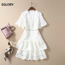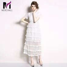 מעצבת מסלול 2019 שמלת תחרה לבנה שמלת שרוול קצר שרוול קצר מקסי שמלת עוגה שכבה נשית הולו אלגנטית ארוכה שמלה