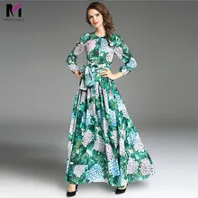 מעצב אופנה מסלול חדש באיכות גבוהה 2019 שמלת מקסי שמלת שרוול ארוך נשים עלים ירוקים פרחוני הדפס פרחוני שמלות ארוכות מזדמנים