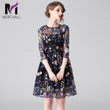 מרצ'אל ניו אביב אביב קיץ שמלה בוהמית אופנה חדשה וינטג 'חצי שרוול רקמה סקסית רשת פרחונית דקה שמלת מיני שחורה