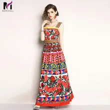מרקל באיכות גבוהה 2019 קיץ נשים מסלול רצועות ספגטי רצועות ססגוניות רוז פרחוני מודפס שמלה קפלים פלוס גודל